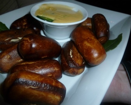 Chef Greeley admitted that his favorite dish on the new menu is the New York mini-pretzel served with jalapeño cheese sauce (left), but emphasized that the new fare is meant to be sophisticated and fun, just like at the '21' Club. "I wanted it to reflect New York City. I wanted it to be familiar to someone traveling to America, or an American, hence, Buffalo shrimp instead of Buffalo wings, goat cheese sauce instead of blue cheese sauce, making it a little lighter — health-conscious as well...Doing it with the correct ingredients like mini tacos — sourcing them correctly."