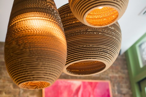 The menus are made from repurposed cardboard boxes, too; Hill notes that "Some artist was hired to choose these colors and fonts and to create the design of this box for a company. We can't throw them away; they're such a resource for our company."