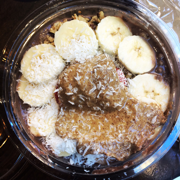 Açaí bowl from Juice Generation, New York City. The base of this dish is a smoothie, which is made with fresh fruit and frozen açaí berries. The toppings included nuts, coconut flakes, blueberries, banana, and almond butter. I discovered this when I wanted to have something more filling than a smoothie for breakfast.