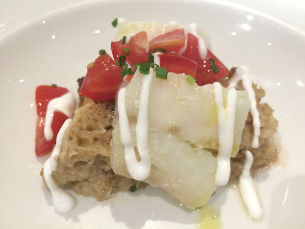 Bread soup with olive oil-poached cod served at an Eataly (New York City) cooking class by Moreno Cedroni, the owner–chef of Madonnina del Pescatore in Senigalia, near Ancona, and several other restaurants in Italy. I have to admit I was skeptical at first: fish on top of bread soup? What? But this was unlike anything I have ever experienced. The finishing touch of the cod-mayo sauce drizzled on top of the tender, flavorful fish really made the dish stand out.