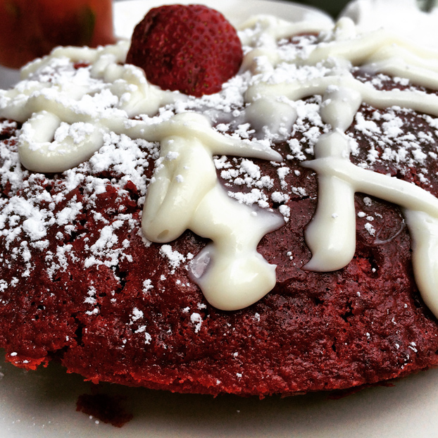 Red velvet pancakes from Two Door Tavern in Brooklyn. Simply put, the best, most indulgent brunch dish I have ever tasted. The three large red velvet pancakes arrive topped with a hefty dusting of powdered sugar and cream cheese frosting, of course.