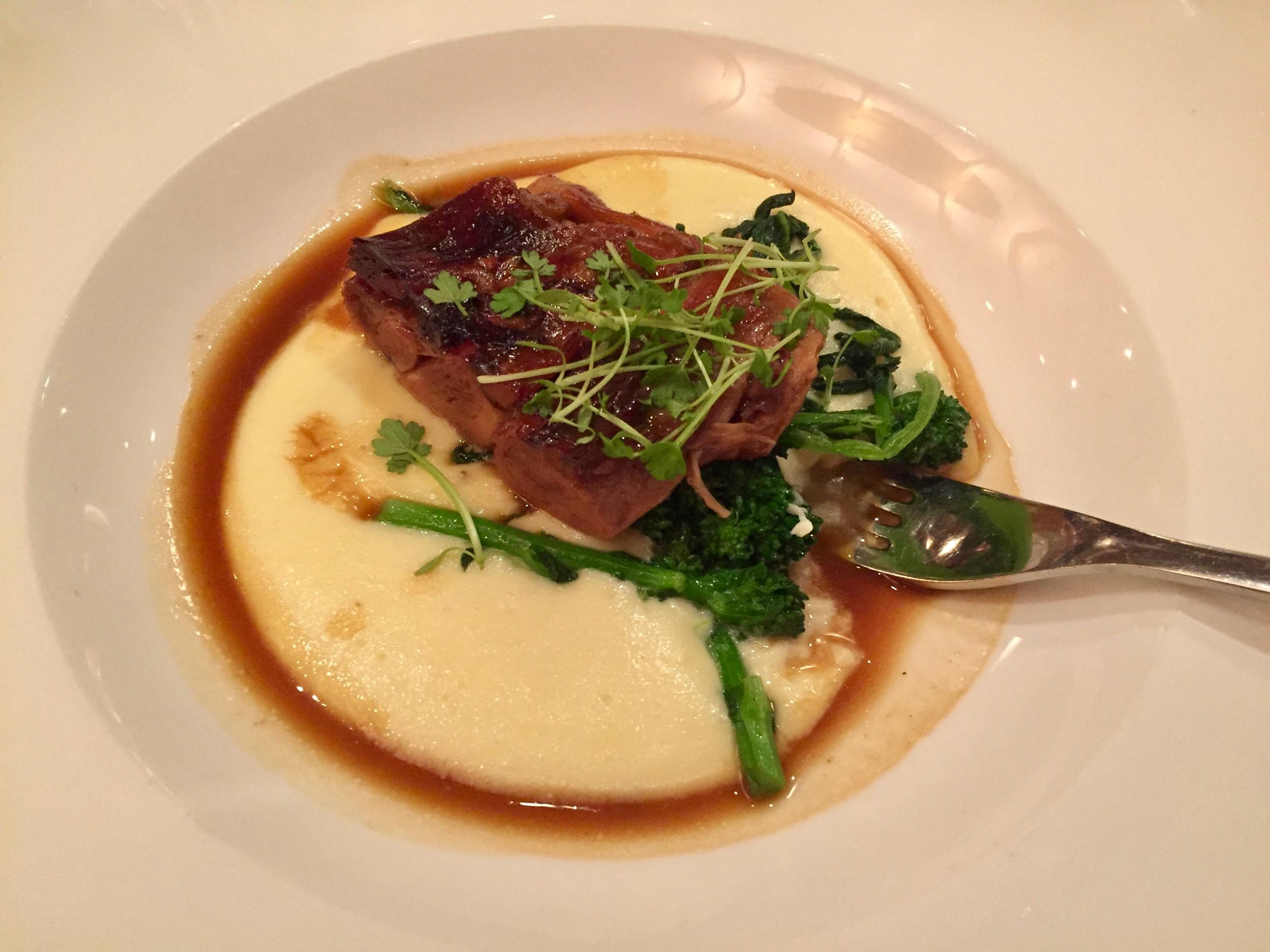 Chef Alexander Burger of the host restaurant, Bar Boulud, was responsible for two courses. The first, passed canapés, included a glorious black truffle goat cheese from artisanal California cheesemaker Laura Chenel, a petite breakfast goat cheese from Marin French Cheese of California, and finally a Gabietou from Mon Fromagerie in Roanne. These rich cheeses were accompanied by Champagne Brimoncourt Régence Brut, Château de Berne's Côte de Provence rosé, and a red Bordeaux from Légende, the venerable Château Lafite's entry into more moderately priced wines.