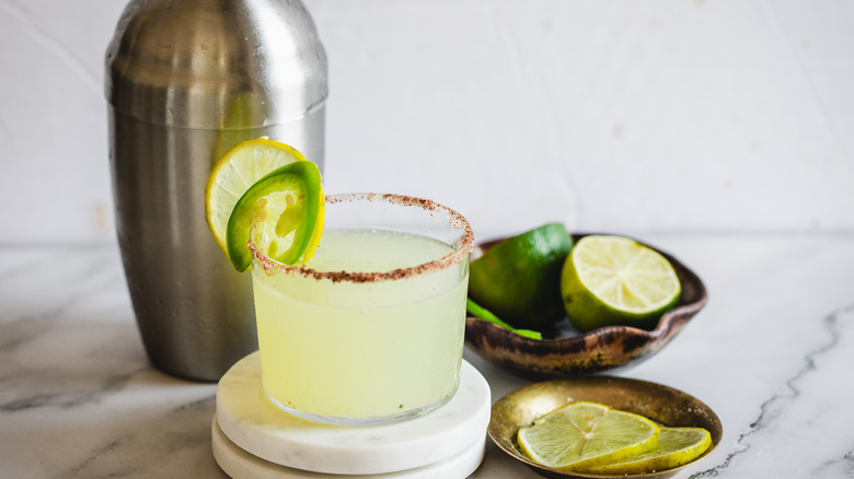 Fill a tumbler glass with ice cubes. Strain the margarita into the glass, then garnish it with a lime slice and jalapeño slice. Now, you're ready to sip and enjoy this deliciously spicy cocktail. Naturally, some Mexican fare would pair well here — chips and guacamole, tacos, or some fajitas would all taste great with this margarita!