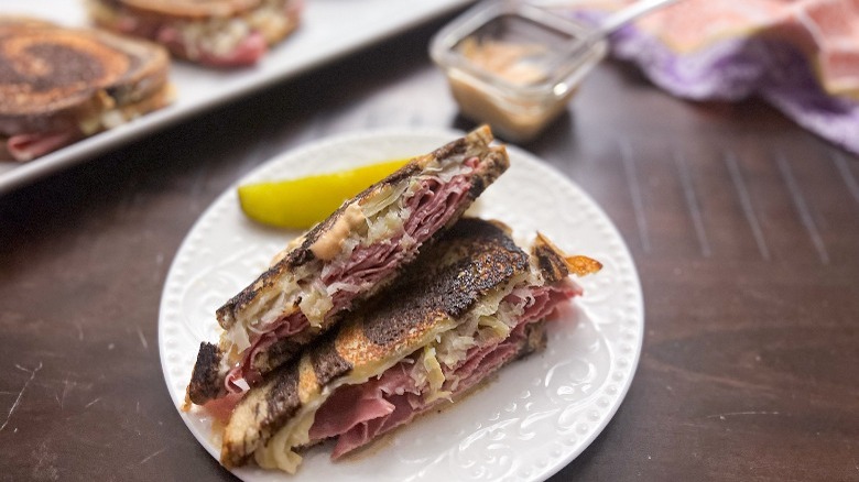 To start, spread the mayonnaise on the outer sides of the bread. Then, add the Thousand Island dressing to the inner sides of the bread. To do this without getting mayonnaise all over your kitchen counter, Johnson recommends putting "two slices together mayo side to mayo side to assemble the sandwich." Then, add the corned beef first, then the sauerkraut, and Swiss cheese on the dressing side of the bread, before topping the sandwich with the other piece of bread. Remember, the mayonnaise should be on the outer edges of the sandwich to help it get nice and crispy in the skillet.