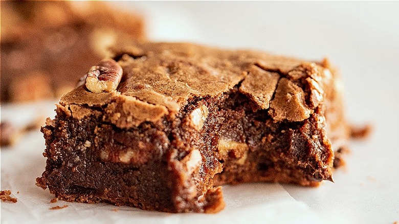 Everyone has a brownie texture preference, and this recipe by developer and production baker Michelle McGlinn is the perfect recipe for lovers of fudgy, dense, moist brownies. That is, brownies that are rich and gooey rather than light and fluffy. These are great on their own, but are also the best kind of brownie for eating warm under a scoop of vanilla ice cream. If you're allergic to nuts, simply omit the pecans from this recipe for an equally as delicious, nut-free brownie. This recipe was made and tested using bourbon, so while you can't omit it, the taste is subtle and the alcohol bakes out making it a delicious treat for anyone. Ready for your new chocolate obsession? Read on below.