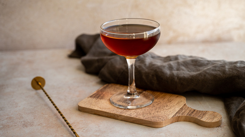 Strain the cocktail into a coupe glass, or cocktail glass of your choice, and enjoy. It's always nice to enjoy a good cocktail solo, but sometimes you want to pair it with a bite to eat. Luckily, Musgrave provides a few of her favorite serving suggestions to pair this drink with: "I'd pair a Manhattan with mixed nuts and potato chips. Salty snacks are a great balance to the strength of the rye."