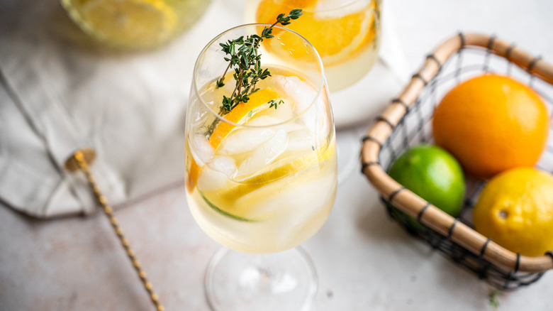 Grab a few serving glasses for you and your friends and fill them with ice. Pour the sangria into each glass and add a little sprig of thyme for garnish. "Thyme has a fresh herbal flavor that is a great complement to this sangria," Musgrave notes. "Mint would also be a great garnish."