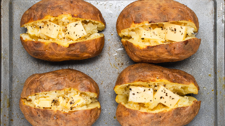 It's never a bad idea to go back to basics from time to time, and these classic oven-baked potatoes are a great example. Whether you are looking for something to pair with steak, chicken, or fish, the always-classic baked potato pairs well with any main course. And, thanks to the starch, it makes for a very filling side. Even though many people will order a baked potato to accompany a pricey main at a steakhouse or upscale restaurant, the baked potato is actually super affordable and easy to make, especially in the comfort of your own home. All you need to do is get a handful of ingredients from the store and set aside a few minutes to prep the potatoes, and the majority of time is spent waiting for them to bake perfectly in the oven.