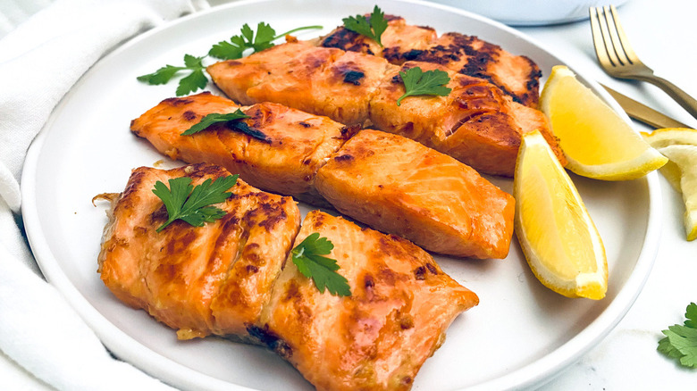 - Garnish the salmon with lemon wedges, if desired.