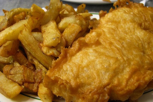 The "fish" in fish and chips is generally cod or haddock, but other white fish like pollock, plaice, and skate aren't uncommon, along with halibut, flounder, and tilapia in the U.S. It all comes down to what's available, and many restaurants will let you choose from several options (be wary of a restaurant that can't tell you what kind of fish goes into it). Batter is generally just flour and water, with some baking soda and vinegar added, but some restaurants replace the water with beer or milk. As for the chips, British fries are usually thicker than their American counterpart, with a super-crunchy exterior and light and fluffy interior. The whole platter is usually served with a wedge of lemon and some malt vinegar on the side, and in the U.S. you'll usually find tartar sauce on the side as well. A popular side dish is mushy peas, which is exactly what it sounds like: peas cooked down until they're mushy (it tastes better than it sounds).