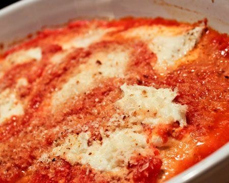 A cheesy, tomato sauce-covered comfort food, this recipe is best served with a side of pasta. This variation of the recipe is a little lighter than traditional chicken parmigiana but it's just as tasty (I promise).