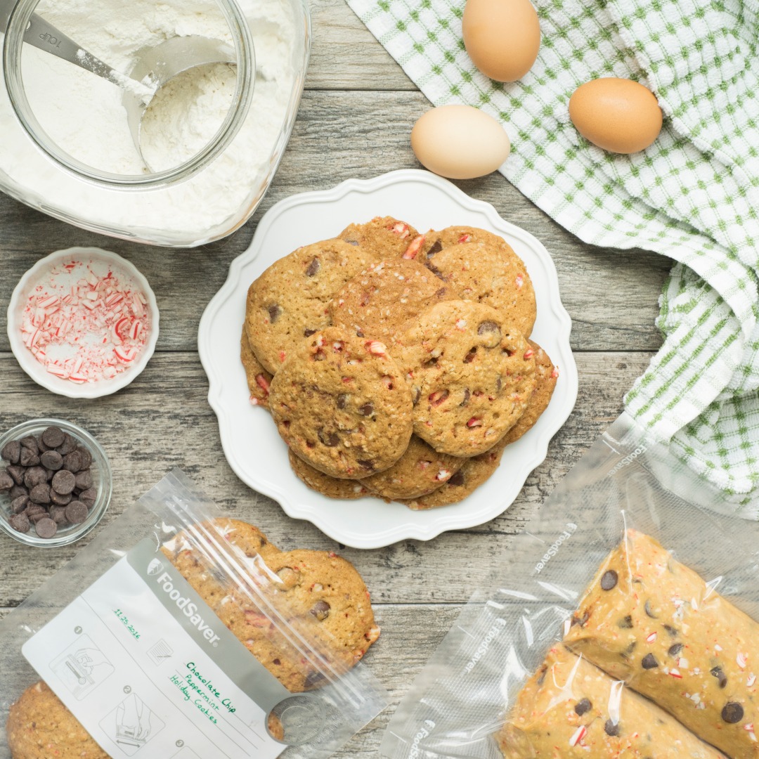 First up is a recipe for Chocolate Chip Peppermint Cookies from FoodSaver spokesperson and host of Southern at Heart on the Food Network, Damaris Phillips. You can whip up a few batches of the dough before the season gets too hectic and freeze it for later. You can also store baked cookies in your refrigerator or pantry in FoodSaver® Vacuum Seal Bags to keep them fresh.