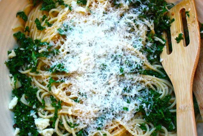 For this dish, as the pasta bubbles away toward al dente, kale strips are tossed with oil, red pepper flakes, and lemon juice to begin to break down the kale's tough fibers. The pasta is then added into to the mix —with a touch of pasta water for added moisture — then generously sprinkled with pecorino cheese.
