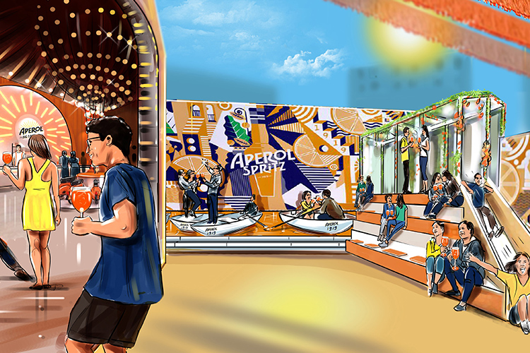 the Aperol Big Spritz Social will be able to sip spritz all night long from the U.K.'s biggest ever Aperol Spritz bar, crafted by Aperol's Italian brand ambassadors, while listening to various DJs scratch beats. The festival also features an "Aperol orange" canal in which attendees can row little boats, a Vespa carousel, and even a pergola connected to a fun slide.