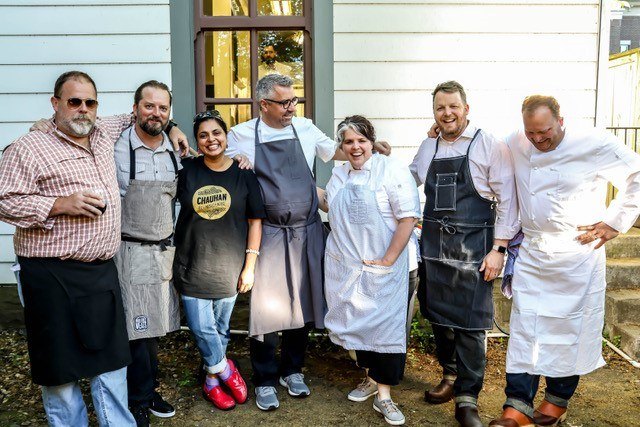 The family-style dinner began with a fabulous dahi papadi chaat from chef Maneet Chauhan (Chauhan Ale and Masala House, Tànsuŏ). Course one, created by chef Rob Newton (Nightingale 9), was a gnocchi with crab, asparagus, and arugula. Chef Andrew Little (Josephine) made smoked monkfish, asparagus, and mushrooms. Chef Erik Niel (Easy Bistro) chose to combine braised beef, embered local shiitakes, mushroom soubise, watercress, and spring onion ash in the next course. For dessert, chef LisaMarie White (Marsh House) used Olive & Sinclair dark chocolate pâté, salted caramel, and toffee with sweet ice cream.