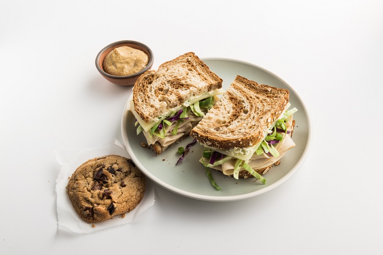 Sliced turkey, Manchego cheese, crunchy Mediterranean slaw, and feta spread on marble wheat bread, served with a chocolate chip cookie.