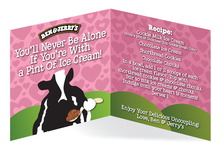 "Delicious Uncoupling" is the name of the Ben & Jerry's recipe, and it includes cookie milk ice cream, chocolate ice cream, shortbread cookies, and chocolate chunks. The recipe was made especially for HuffPost, but they've posted it online for the benefit of lonely hearts everywhere. It's not a flavor, per se, so you won't find it in pints at the grocery store — but following the recipe at home might help you pass the time on, say, the evening of February 14.