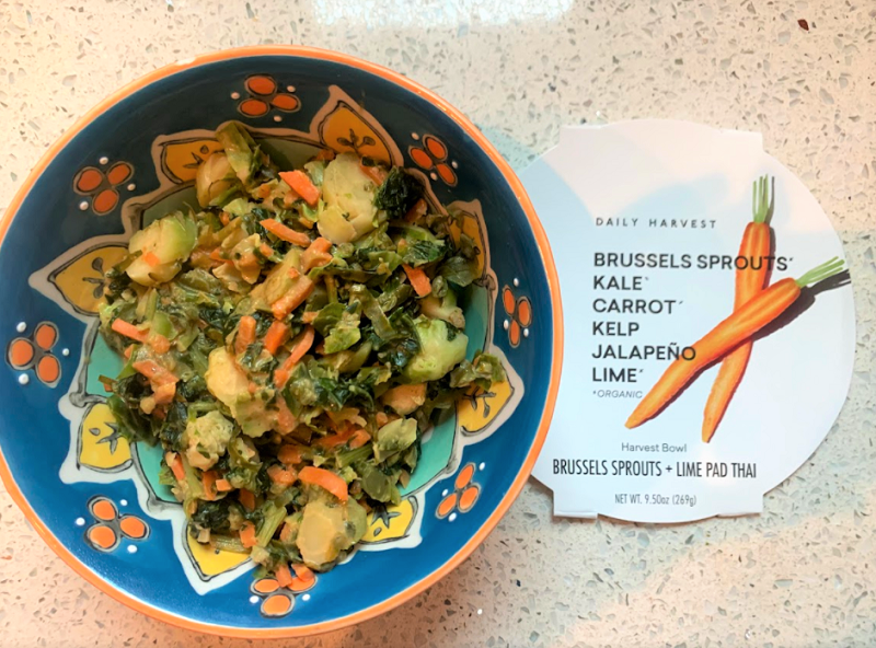 I also tried a few of the harvest bowls, for these, you just add water to the bowl and put it in the microwave for a few minutes. My favorite was the butternut squash and kale shakshuka, which had a nice blend of autumn flavors. I also tried the Brussels sprouts and lime pad thai harvest bowl, but it had a mushy consistency, and the veggie noodles didn't replicate pad thai very well. Overall, I thought the bowls and flatbreads were good but not very filling. They work better as a lunch option.
