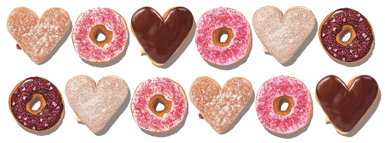 Heart-shaped doughnuts are also making their grand return to stores for a limited time this season, available in several varieties including Boston Kreme and Jelly. Additionally, classic frosted doughnuts are getting a lovey-dovey look with sparkly new "bling sprinkles." Find them on chocolate-, strawberry- and vanilla-frosted doughnuts.