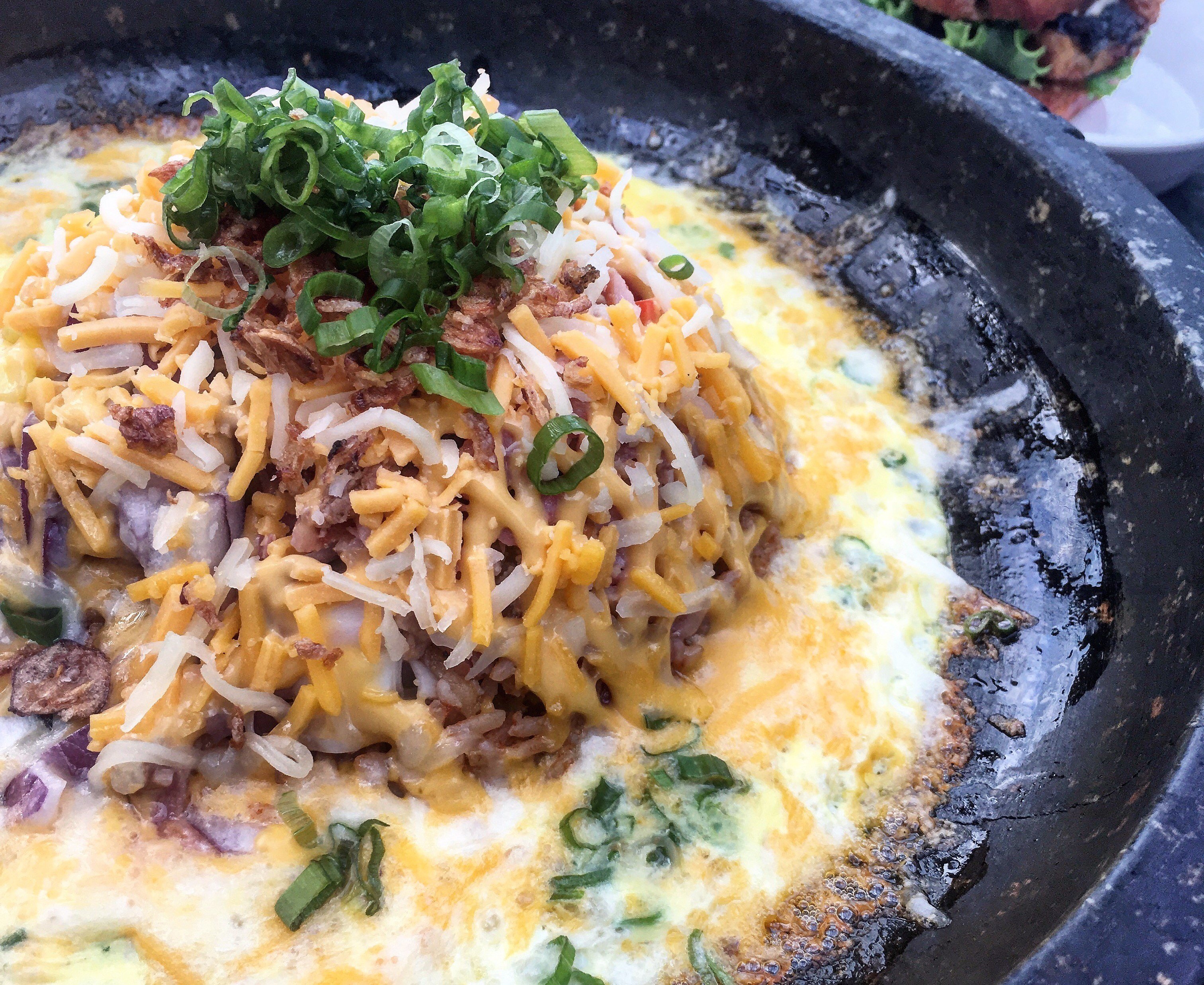 Another must-try is the "Cheese N' Cheese," which is essentially exactly as it sounds: cheese on cheese on cheese that is then fried with rice. The dish arrives in a hot skillet, which quickly fries a mix of Cheddar and mozzarella cheese, rice, egg, and smoked bacon, grilled spam (an interesting and tasty addition!), corn, onion, and peppers. After a minute or two, the rice turns delightfully crispy. Mix the cheese, rice, egg, and veggies together to create a cheesy fried rice bowl unlike any other.