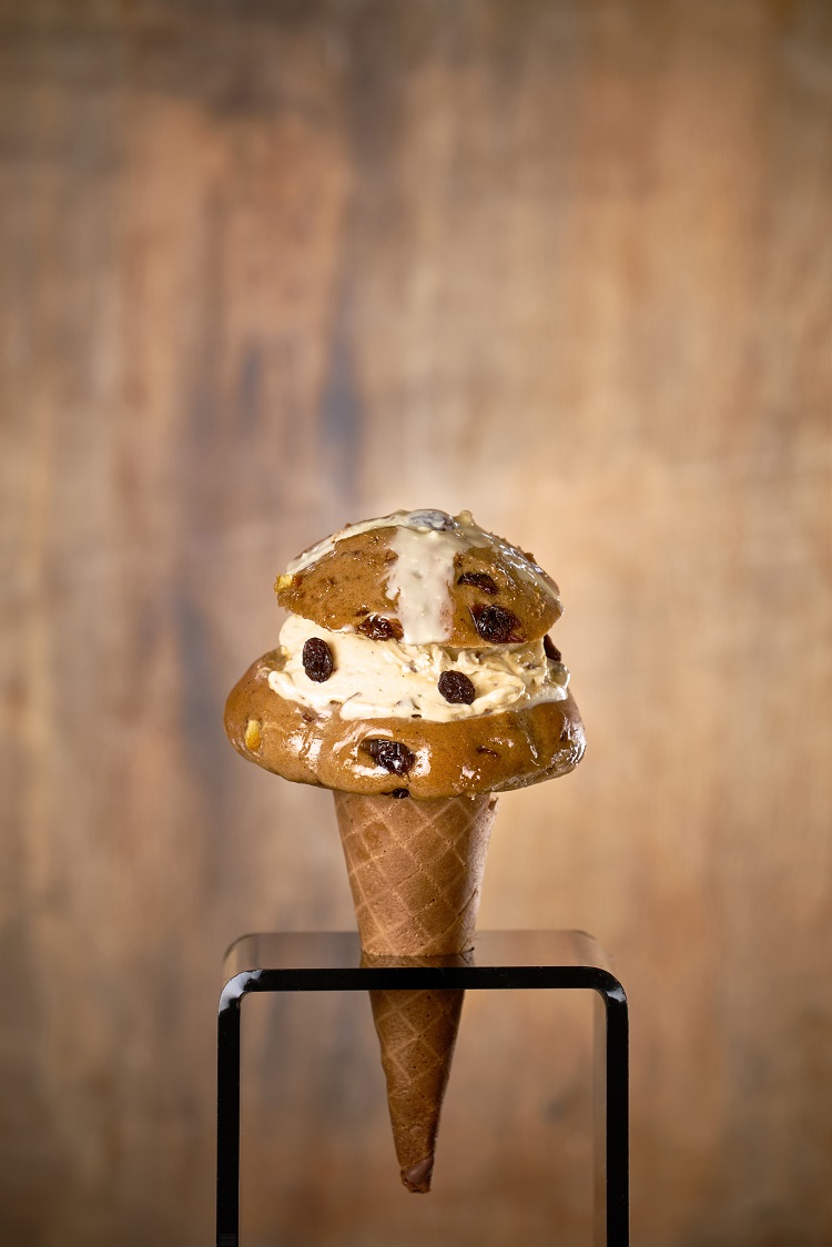 Giapo's R&D Kitchen in Auckland has created a "Hot Cross Bun Cone," built with part cone and part bun. The bun, which is served warm, is baked with orange juice-soaked raisins and a blend of cinnamon, clove, and candied orange peel.