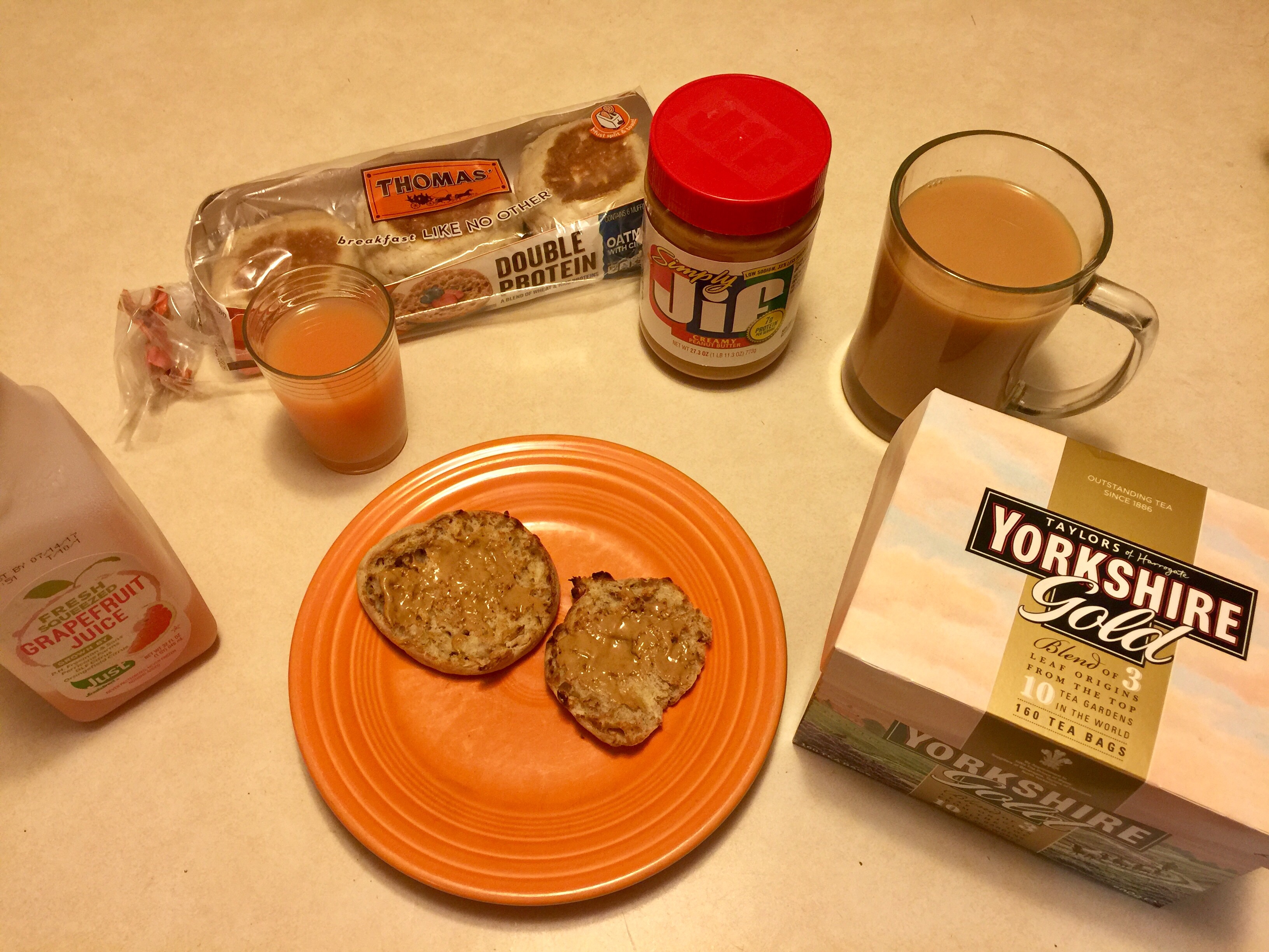 5 a.m. — Lately I've been loving these Thomas' English Muffins Double Protein with Oatmeal variety, toasted, with a schmear of Simply Jif peanut butter. I love coffee but can't stomach it first thing in the morning, so I make a mug of Taylors of Harrogate Yorkshire Gold tea with two percent milk.