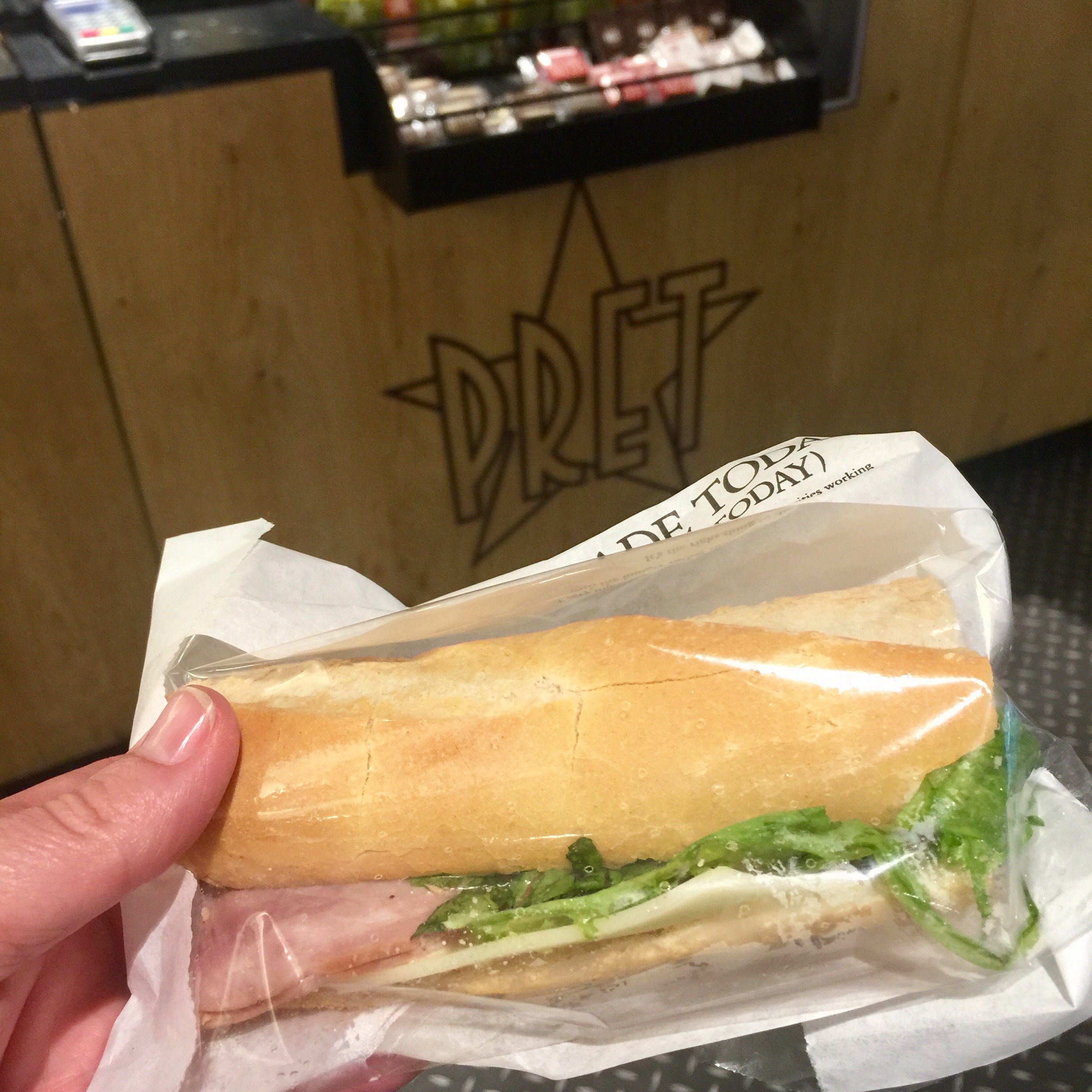 7 p.m. — I duck into a Pret A Manger on my way to the bus station, but breakfast was hours ago and there is not an egg or oatmeal dish to be found, not even any yogurt. So I grab the most breakfast-appropriate thing I can find: a ham and cheese sandwich on French bread, something I definitely eat for breakfast while traveling in Europe.
