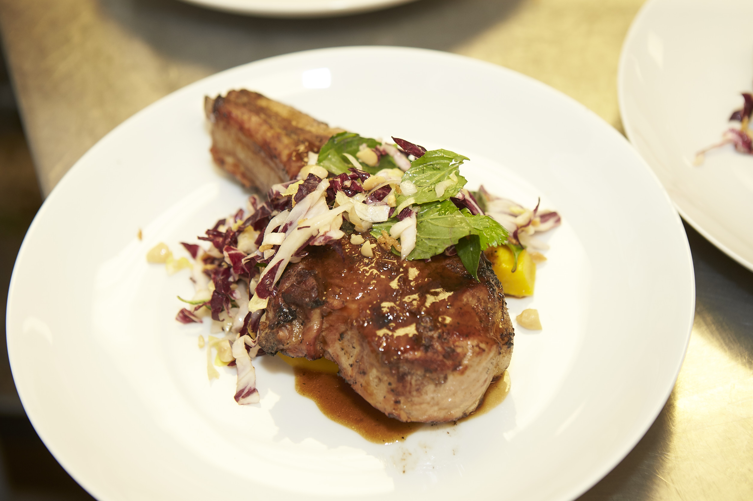 The main dish of the night was a crowd favorite served up Gavin Kaysen, James Beard Award winner and chef-owner of Spoon and Stable in Minneapolis. His tamarind-glazed pork chop with delicata squash, puffed rice, toasted peanuts, and pork jus was paired with a Boomtown by Dusted Valley Merlot.