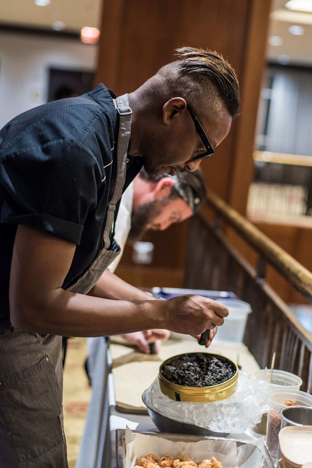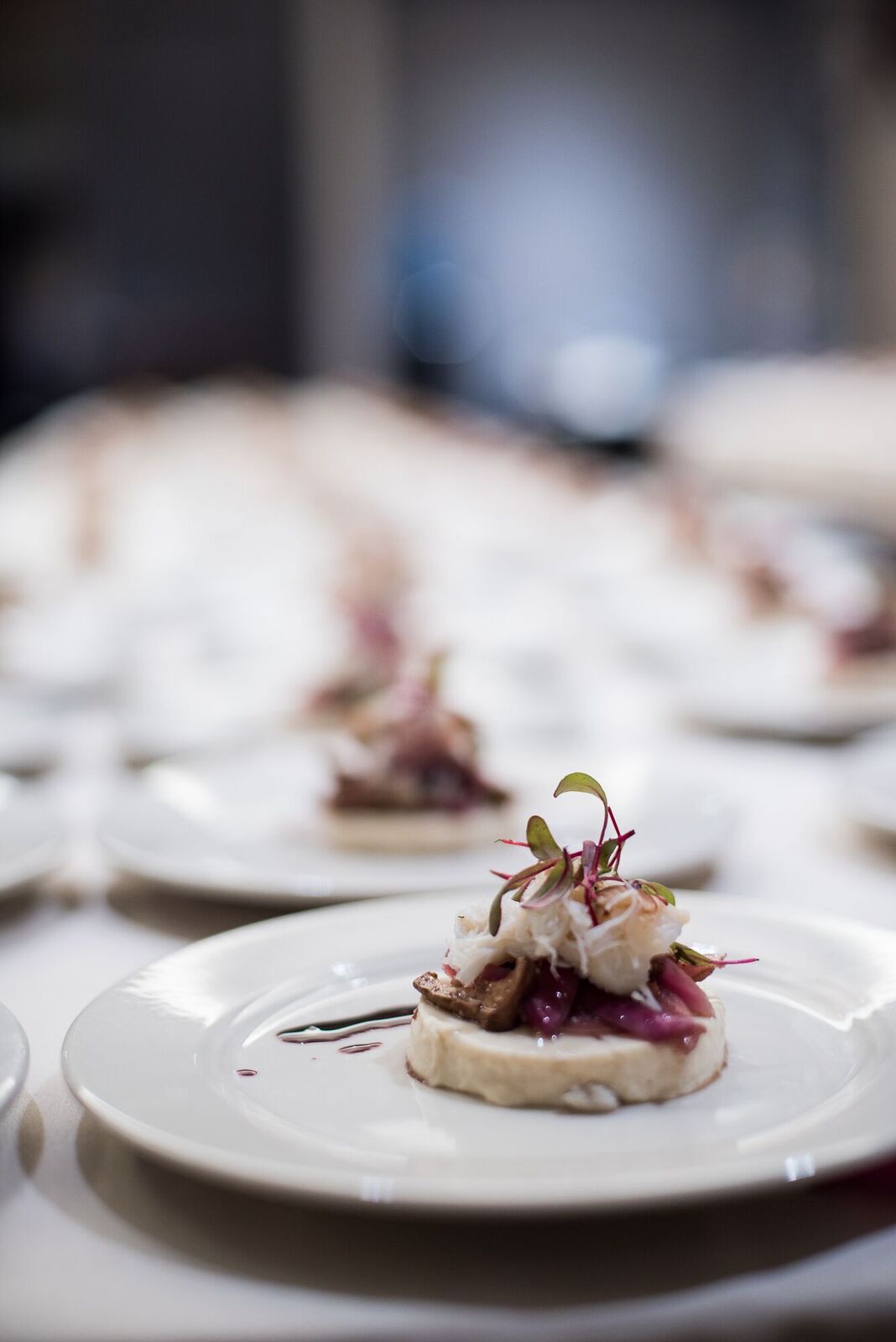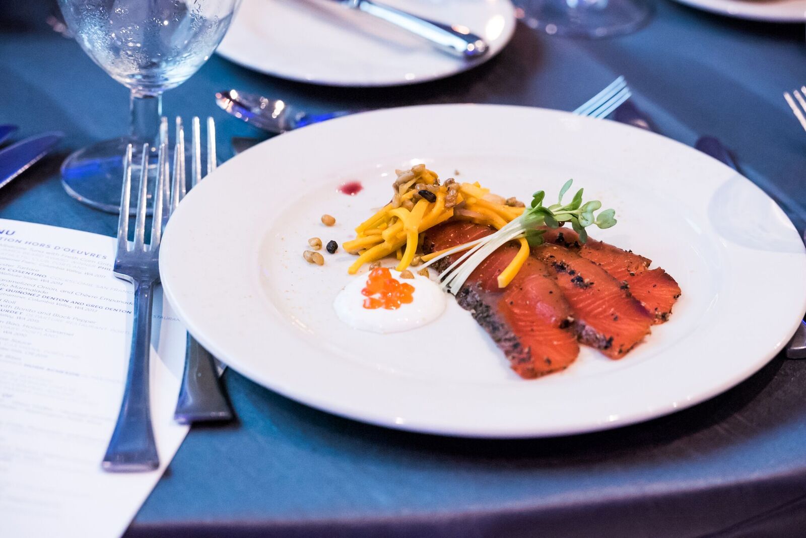 The evening began at 6:30 p.m. with a cocktail hour featuring eight chefs from Portland and abroad, as well as wineries, breweries, and distilleries. One of the most standout bites of the hour was a foie gras hum bao with hoisin caramel sauce from Sarah Pliner of Portland's Aviary, a perfectly fluffy steamed bun with a delicate mix of pork and foie gras inside. Other chefs included James Beard Award winner and educator Philippe Boulot, Chris Cosentino of Cockscomb in San Francisco, Gabrielle Quiñónez Denton and Greg Denton of Ox Restaurant, Gregory Gourdet of Departure Restaurant and Lounge, and Justin Woodward of Castagna. James Beard Award winner Hugh Acheson, who did not attend the event, provided the recipe for a dish that delighted us during the reception. During the cocktail hour, guests were invited to bid on silent auction items while they sampled wines, drinks, and hors d'oeuvre.