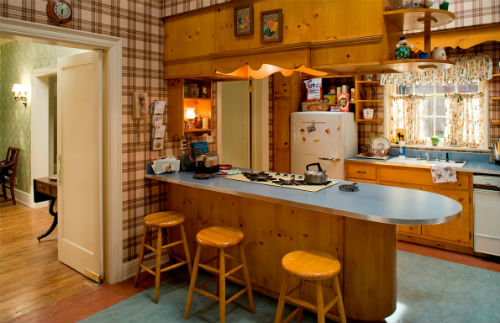 Plaid wallpaper, frilly curtains, baby blue work surfaces, and pine cabinets come together to make the most perfect retro kitchen. Every detail of our '60s aspirations is achieved in Betty Draper's perfect kitchen.