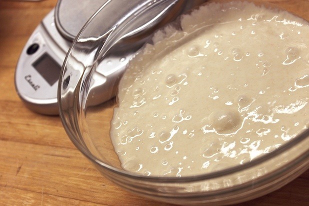 Poolish has become our favorite starter in the bakery. We enjoy using it because it gives our bread a moist, open-holed crumb, a chewy texture, and a sweet, pleasant flavor of fermentation without any sourness. Don’t be discouraged by the process of making a starter. Poolish is very easy to make and adds so much character to breads like French baguettes and rustic Italian bread. It’s made from the tiniest bit of yeast we can measure, combined with equal weights of water and flour. The mixing takes about 3 minutes, and the rest of the work is done by the yeast which slowly ferments with the flour and water. The poolish should be mixed 6-24 hours before you plan to make your bread. When used in your dough, the final result will be sophisticated bread that makes you look like a professional baker. Click here to see the How to Make Amy's Bread Slideshow. Adapted from "Amy's Bread, Revised and Updated" by Amy Scherber, Toy Kim Dupree, and Aimee Herring.