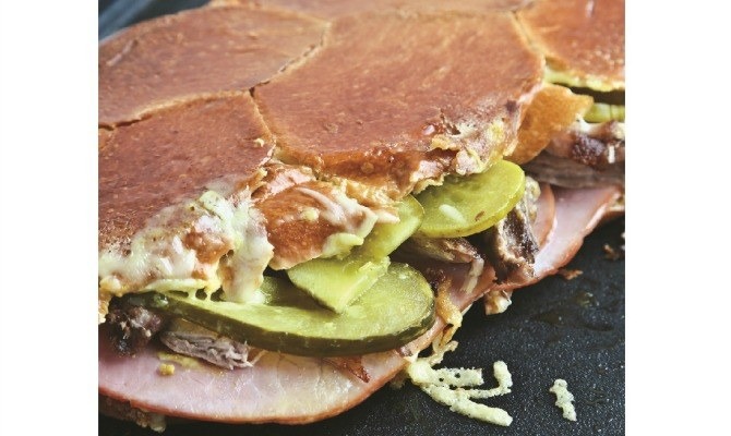 - The order of assembly is important here! Spread the bottom slice of bread with mustard and sprinkle with the Gouda. Build the rest of the sandwich on the top slice of bread, starting with the Gruyère, followed by a slice of ham and the Barbacoa. Place a liberal layer of pickles over the pork, and top that with a full-on slathering of the cilantro mayonnaise. Flip the bottom up onto the top and press down firmly to compact.
