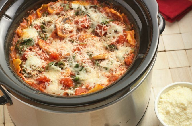 A vegetarian lasagna recipe made with a mushroom-spinach tomato sauce layered with uncooked lasagna noodles and cheese in a slow cooker. Recipe courtesy of Hunt’s.