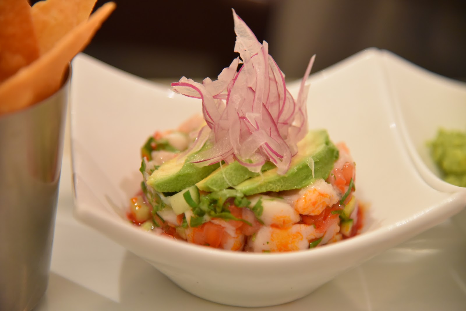My favorite appetizer is, hands down, ceviche mixto. White prawns, mahi-mahi, and scallops ('cooked' in lime juice and tequila) with tomato, red onions, avocado, cucumber, and cilantro. All neatly packaged in a circular disk in a bowl that lets the guajillo oil drizzled on top permeate through the body of the dish.
