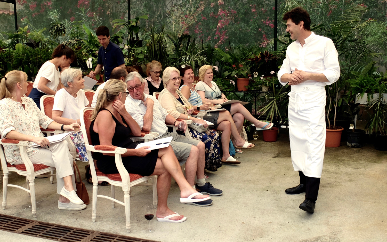 To pique their palates, guests attended master classes held by Holland's Michel Van Der Kroft and Italy's Davide Bissetto, from the aforementioned Cipriani The seafood–laden waters of Venice and Madeira inspired Chef Bissetto's Conchiglie e Conchigliacei, a shellfish pasta dish whimsically made with shellfish-shaped pasta. With the warmth of an Italian nonna and the expertise of a 25-year industry veteran, Bissetto explained how pasta in the south is typically egg free while northern Italy's richer cuisine incorporates eggs. Here, he used egg yolks as a wink to the Portuguese pastries that are packed with yolks, leftovers from the egg whites nuns use to starch their wimples. In the demonstration, Bisetto used sumptuous sauces composed of five kinds of seafood. Luckily, he handed out a simplified recipe even an amateur chef could make. As guests sipped sparkling wine, he showed his signature technique where he spoons dollops of different colored sauce onto a plate, then thwacks it with his hand to spread the hues like an edible artist's palette.