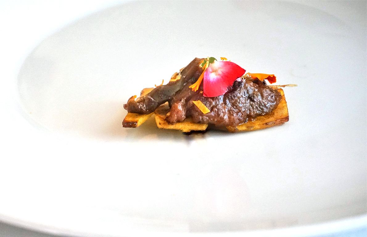 The courses begin with the fish of the day, a sea bream. It's marinated in a Patxaran, a Basque liqueur. Normally served as a digestif, Patxaran is made of wild plums (sloe berry). The fish is topped with chia seeds for an added crunch.
