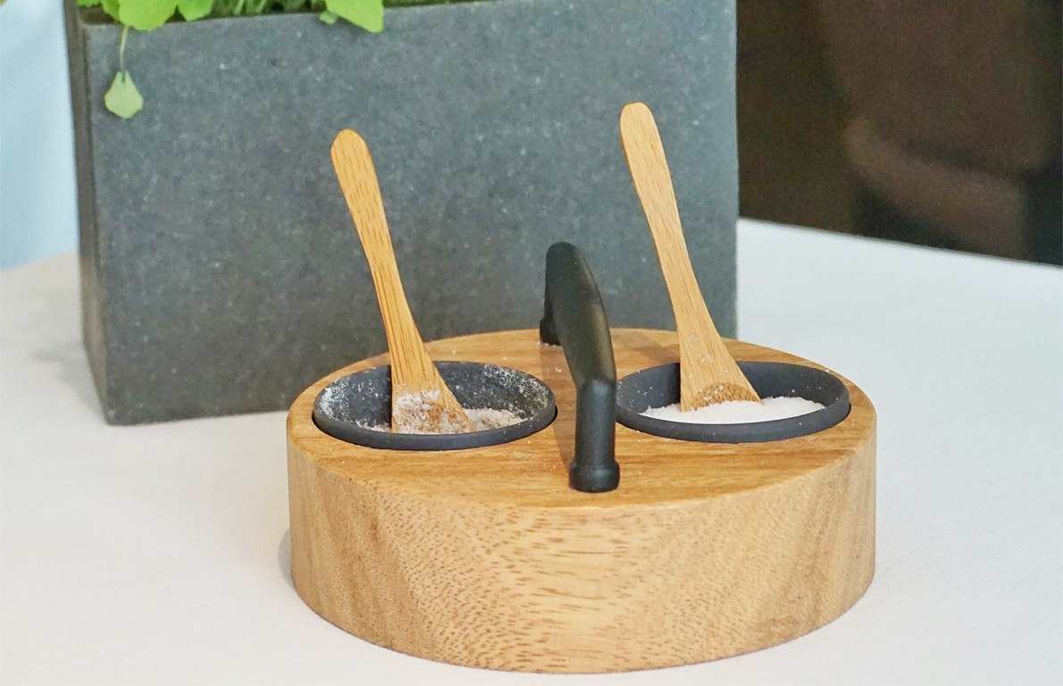 As we take a seat, we first notice the centerpieces. On the table, two types of salt are served: a sea salt and a house-made sea salt infused with seaweed.