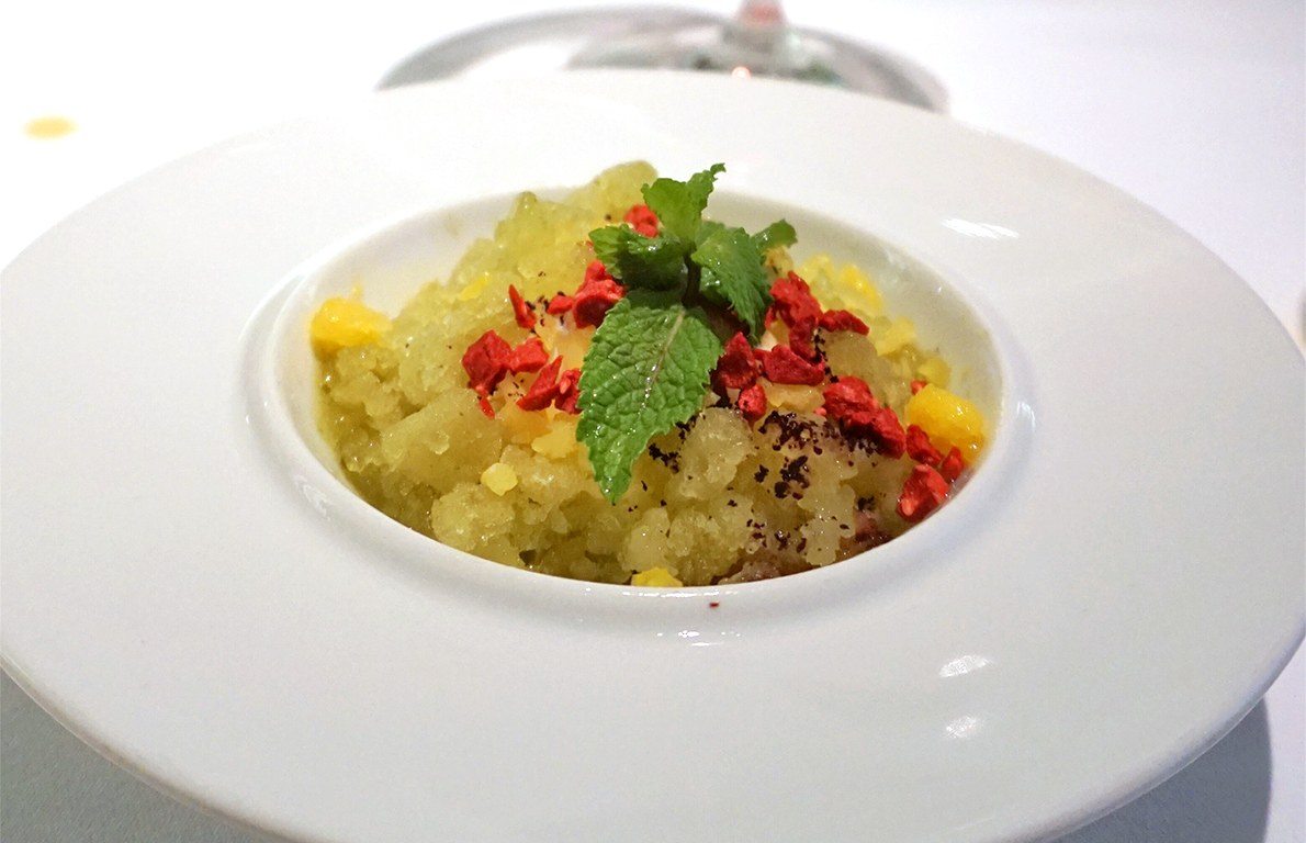 Before dessert, we're served a refreshing granita topped with acai and fruit. Hidden inside is a delicate yuzu ice cream.