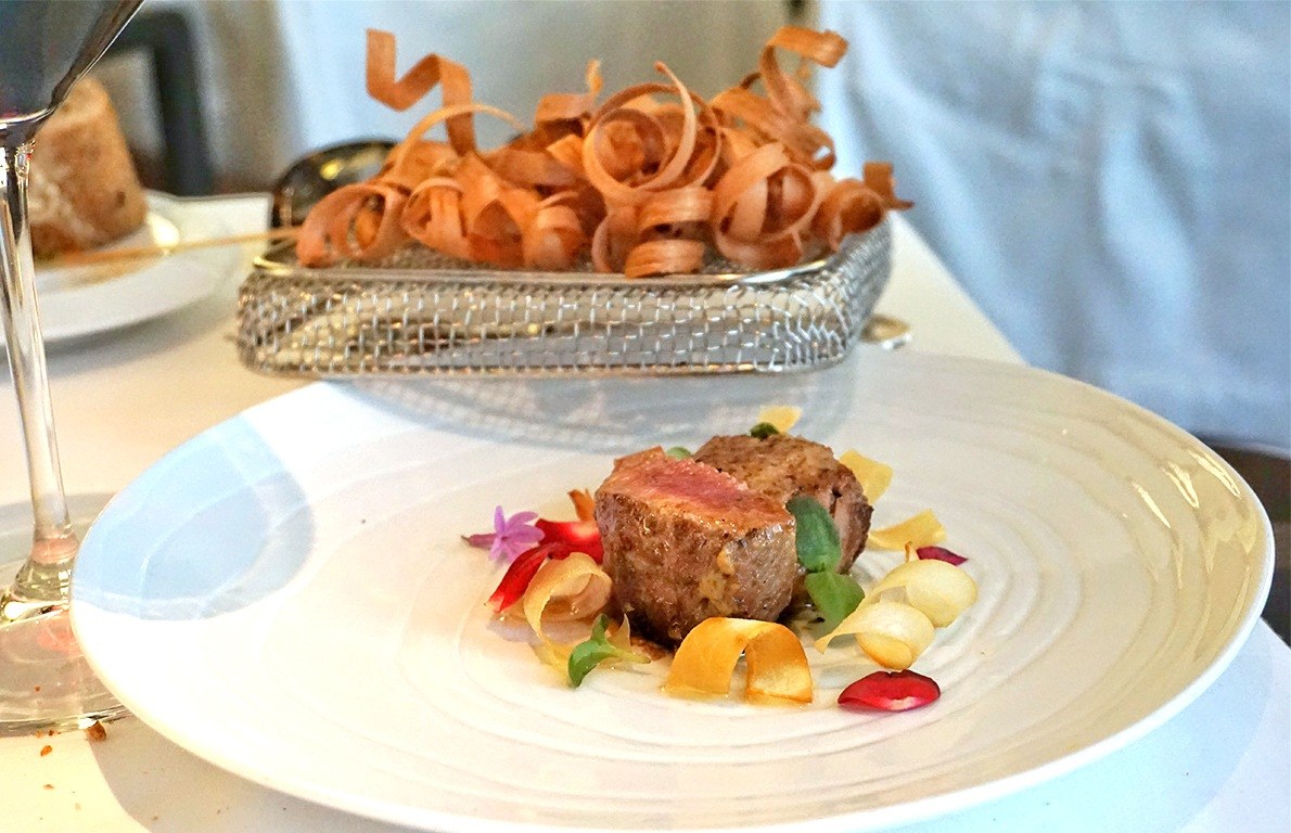 This lamb becomes cage-free once the cover of cypress is lifted. It's done to infuse a cypress aroma, which adds an extra layer to the scent of the dish. The lamb itself is a loin, which is roasted and served over a nut and Armagnac spread.