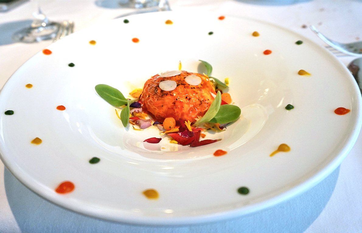 Hidden under a shell are marinated prawns served on lemon grass and mint. The base is a beetroot purée with crunchy krill.