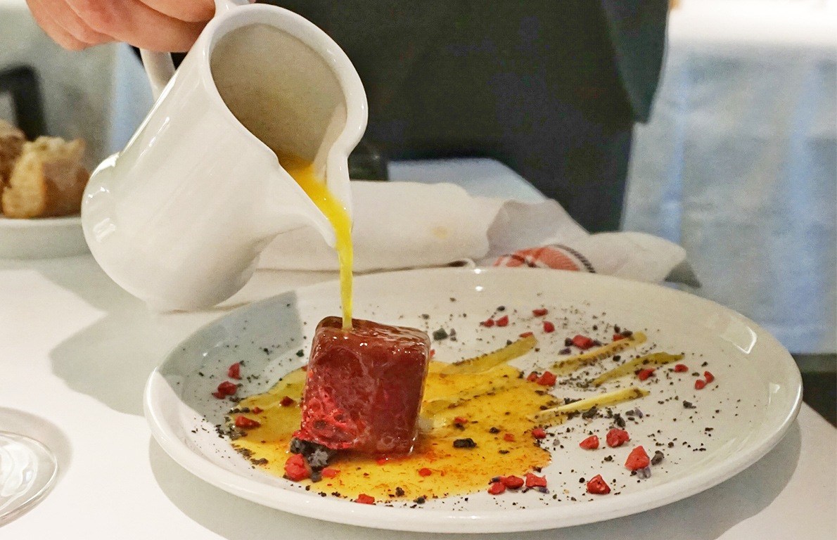 It's interesting to see Michelin-starred chefs get creative with eggs. Elena served us a "red" egg, which is carmine due to a thin veil of red pepper. The colored sauces are parsley and spinach (green), smoked red pepper and annatto (red) and turmeric (yellow). It's one of her favorite dishes on the menu.
