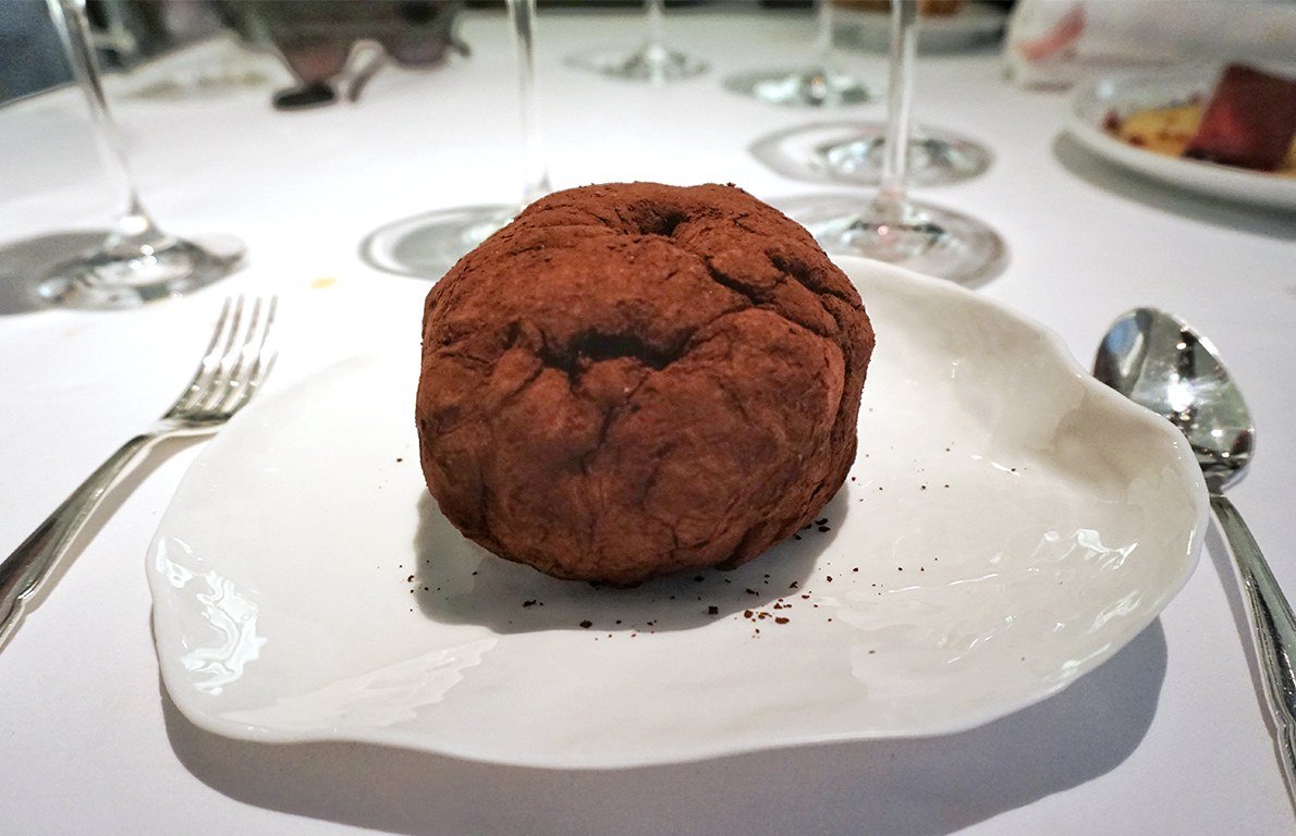 The arrival of dessert is a blessing and a curse. On one hand, it's the sweet endings. On the other hand, it's the endings, which means we're approaching the conclusion. The first of two is the big truffle. It's a large cocoa and sugar truffle that gets coated by a chocolate sauce that the server pours on top. Inside is a chocolate and carob filling. It's an explosion of chocolate but the layers and textures are distinct.