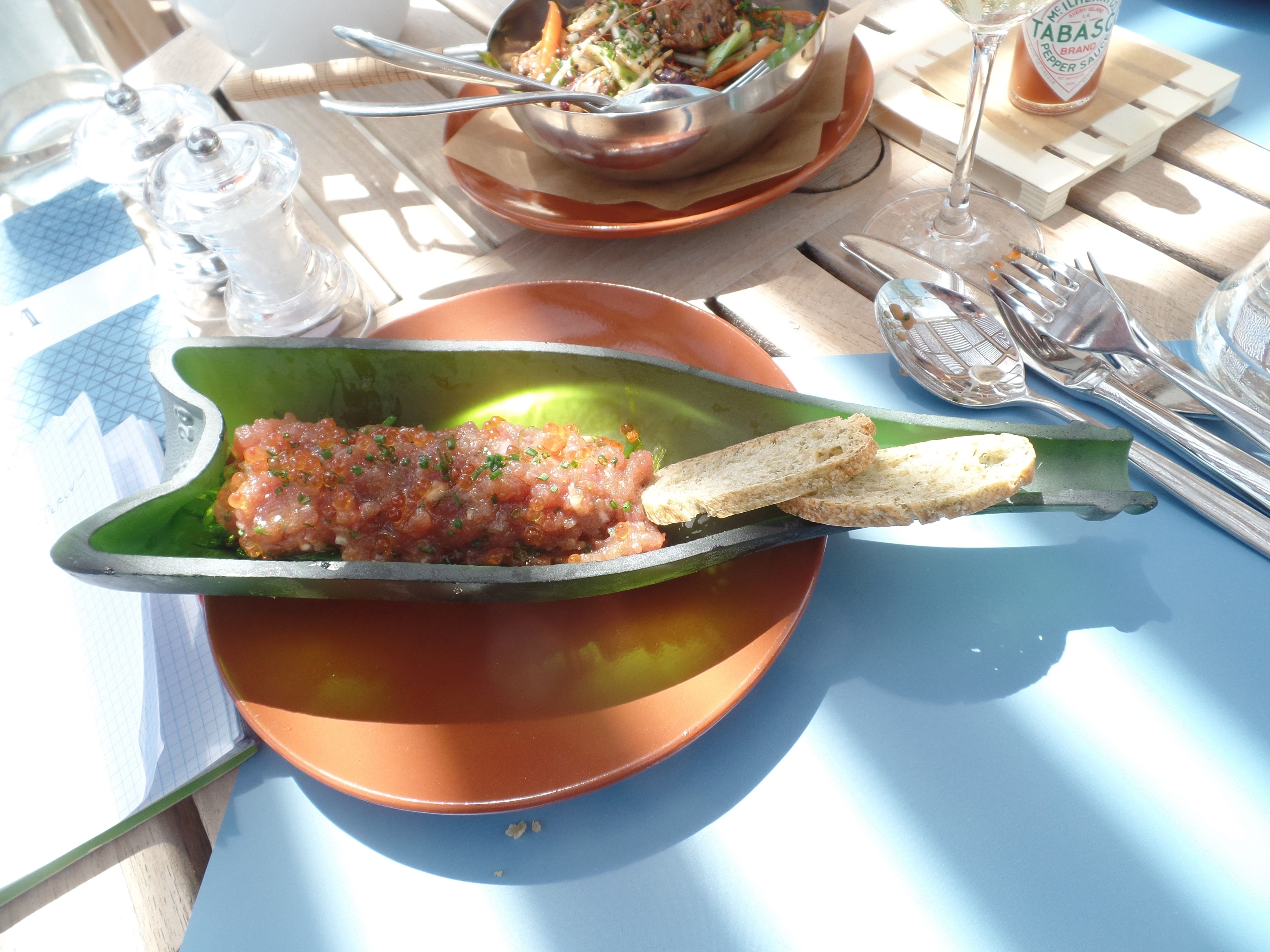 Tuna tartare is another nod to the East, Mediterranean blue fin tuna sprinkled with trout caviar on a bed of wakame, a Japanese seaweed and favorite miso soup ingredient, with seaweed bread.