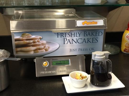 As delightful as Jennifer was, my raging pancake craving could only survive just so much small talk. "Would you like to try some pancakes?" Jennifer finally asked. Of course! We quickly whipped up a batch and I finally got to sample them. The pancakes themselves are medium-sized (the machine allows you to adjust the size of your pancakes, but Alaska Airlines keeps theirs medium-sized to fit on the plates in the Board Room). I'm pleased to say that after numerous samples, I can give Alaska Airlines' printed pancakes the thumbs up. They are fluffy with a sweet, but not overbearing, flavor. And they are pleasantly chewy — not at all spongy like you might expect from an automated chef. Technology, you win again!