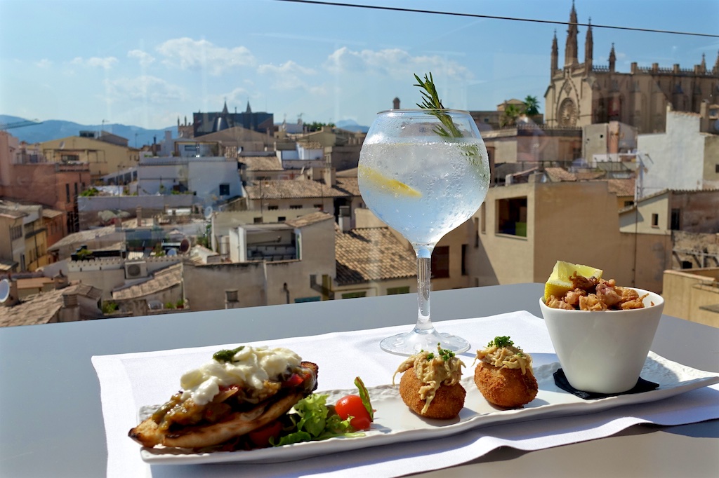 At the top of the hotel lies a breathtaking oasis for guests, with a luxuriously spacious rooftop bar. Sipping on specialty cocktails made from the hotel chef's own local gin, bathing in the contemporary infinity pool overlooking the Mediterranean Sea on one side, and the charmingly rustic, browned residences on the other side places you in an elevated throne with an unparalleled view of the city. Sun beds are promptly tended to, and simple touches like complimentary sunscreen, footwear, and towels continue the theme of homely comforts. Guests can also dine on a selection of local tapas prepared in the rooftop kitchen, including fresh Mallorcan seafood like octopus and fish, as well as traditional Spanish specialties, including a wonderfully refreshing and effervescent gaspatcho, the perfect afternoon snack in the warm climate.