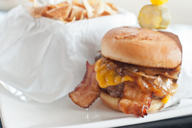 In the Riverfront Club, try the burger topped with applewood bacon, aged Cheddar cheese, and house-made steak sauce, served with with chips.