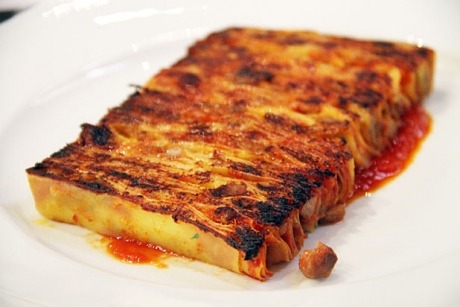 For those who haven't eaten it, the 100-layer lasagna was introduced to the restaurant in 2010 as part of the $500 Collezione menu, a very fancy, nine-course, once-per-service experience served by the chef to the patrons, which includes a 100-layer lasagna, one that requires a process involving an 80-portion pan that has to go into the oven by 1:30 p.m. every day, skewers to hold the lasagna in place while it sets, and a special spatula to serve it. Described as "50 practically transparent sheets of handmade pasta, alternating with 50 layers of sauce (Bolognese, besciamella, and marinara)," the lasagna is delicious. Light, creamy, delicate, nuanced... it's quite a bit of fun. And even better at lunch service when it's presented after spending some time crisping on a flattop, texturally pleasing too with bits of crisp edge.