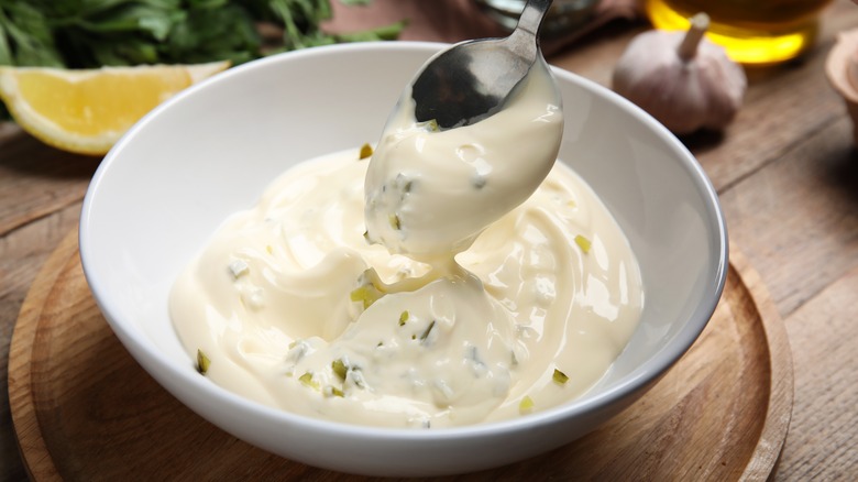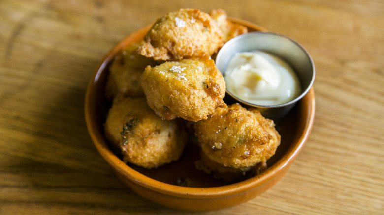 While hush puppies are delicious eaten alone, there are several sauces — both sweet and savory — that make excellent accompaniments. According to Taste Atlas, the fritters are often paired with a simple tartar sauce or smoked trout dip. Both options seem to pay homage to the food's fishy history. They also say hush puppies pair nicely with a glass of sparkling wine, but we assume that is not for dipping.