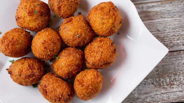 Before diving into the intricacies of hush puppies, we must first answer the question: What is a hush puppy? According to Food Network, hush puppies — a type of fritter — are balls of cornmeal batter and spices that are deep-fried to golden perfection and served as a snack or side dish. The batter must be thick so it can hold its shape when formed into spheres and fried. Hush puppies are typically the size and shape of a golf ball.