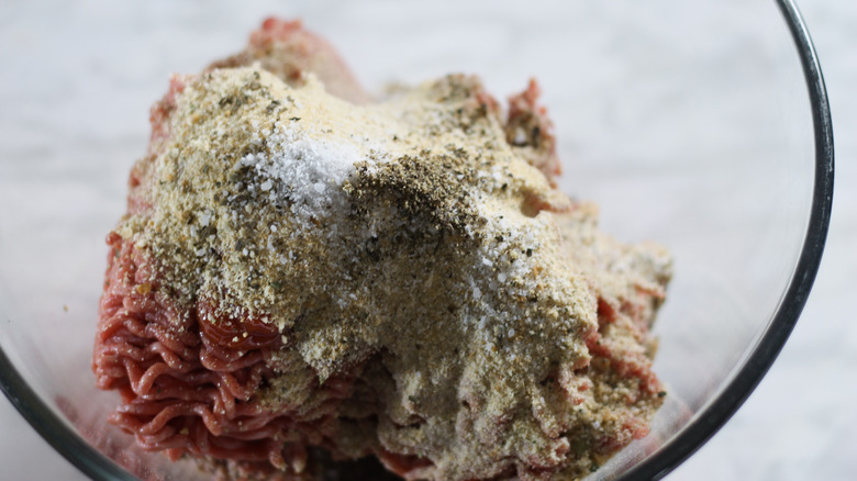 - Add ground beef to a large bowl along with ketchup, the remaining (raw) egg, and Worcestershire sauce. Add in ,osher salt, black pepper, garlic powder, parsley flakes, and bread crumbs.